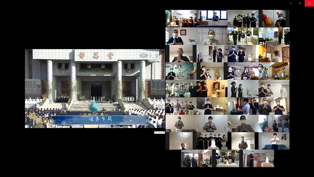 虽然疫情多变,但阻挡不了大家想要浴佛的虔诚。9日清晨六点,东区志工穿戴整齐,纷纷上线作准备,由音控团队给每一个视窗做位置的调整,嘱咐大家站在同样位置,以虔诚心全程参与。