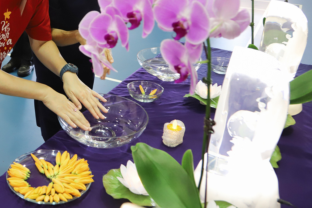 在志工陪伴下,院友井然有序地礼佛,手沾香汤,拿着玉兰花虔诚地合掌祈愿,祝福人人皆能平安吉祥。